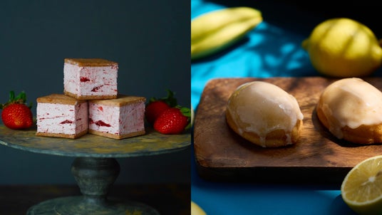 左(いちごバターサンド):100%岡山県産のイチゴ使用し、酸味と甘みの異なる2種類のイチゴソース自社製造。甘めのイチゴをソースを豆乳バターに混ぜ込み、もう一方の酸味のあるソースを仕上げに混ぜ込むことで甘み、酸味の両方を感じるバターサンドに仕上がっています。挟み込むクッキーもこだわり抜き、サクサクの米粉サブレでサンドした贅沢な一品です。右(レモンケーキ):瀬戸内海産レモンの果汁と皮を贅沢に使用し、レモンの爽やかな風味を最大限に生かしたレモンケーキです。しっとりとしたレモンケーキとレモン果汁たっぷりのアイシングの相性が抜群です。
