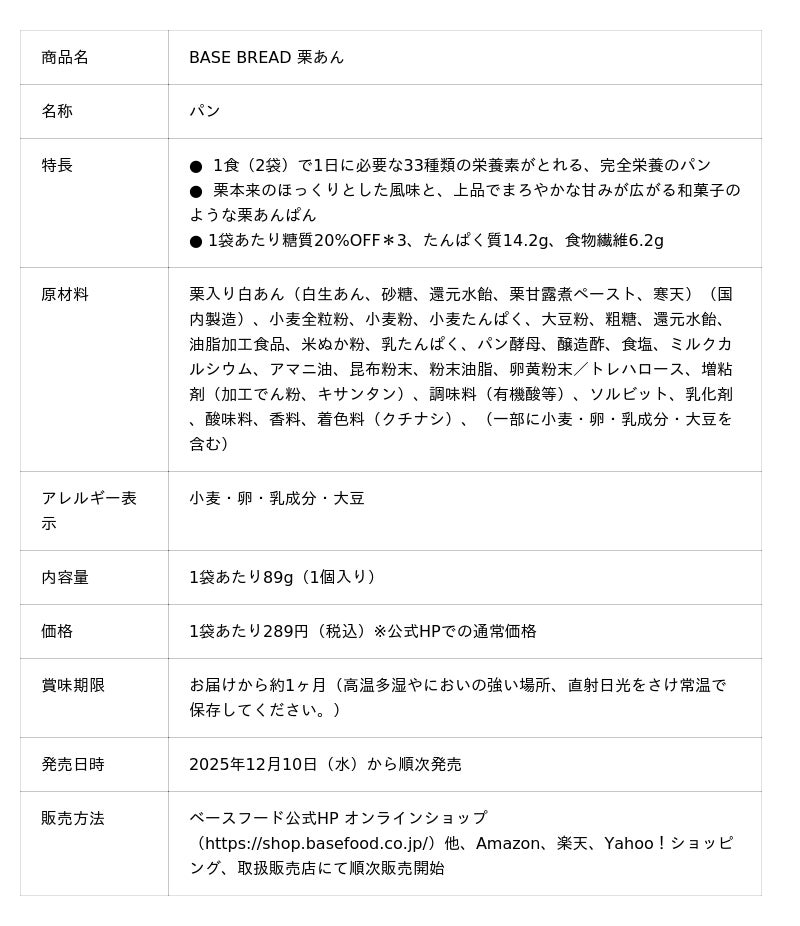完全栄養の主食※1等を開発・販売するベースフード株式会社(本社:東京都目黒区、代表取締役:橋本舜、https://basefood.co.jp)は、1食に必要な33種類の栄養素がすべてとれる全粒粉ベースの完全栄養のパン※2「BASE BREAD(ベースブレッド)」シリーズから、「BASE BREAD 栗あん」を2025年12月10日(水)より公式オンラインショップ(https://shop.basefood.co.jp/)、他ECサイト、取扱販売店にて順次新販売します。