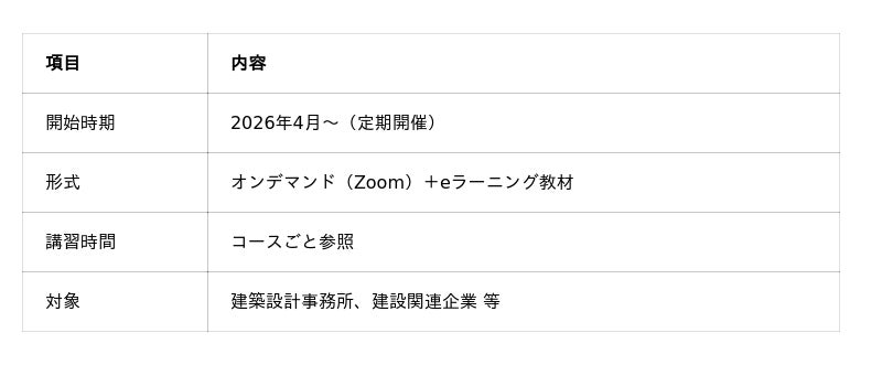 「BIMを誰もが簡単に」をビジョンに掲げ、BIMの普及と活用支援を行う株式会社フローワークス(愛知県名古屋市、代表取締役:横関 浩)は、2026年4月1日より開講する建築設計実務者向けの「BIM定期講習」の申込みの受付を開始しました。