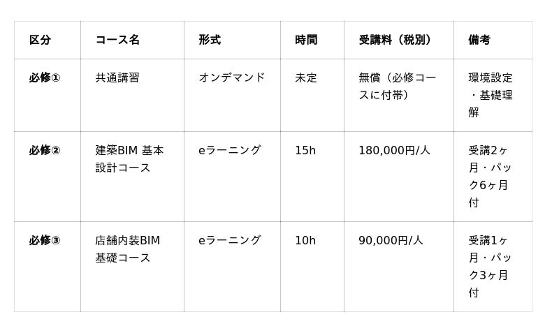 建築BIM 基本設計コース、店舗内装BIM 基礎コースなどの必修コースから、オプションとして確認申請+省エネ計算、BIMコーディネーター/マネージャーコースまで、幅広いコースを用意。受講前のヒアリングにより、最適なコース設計を提案します。