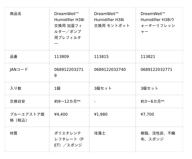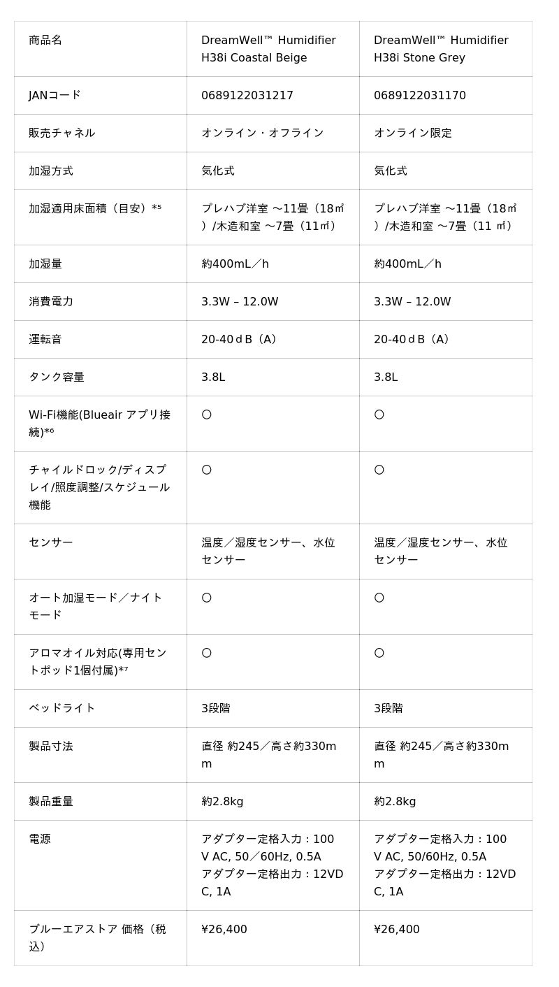 ■「DreamWell(TM) Humidifier H38i 」製品仕様
