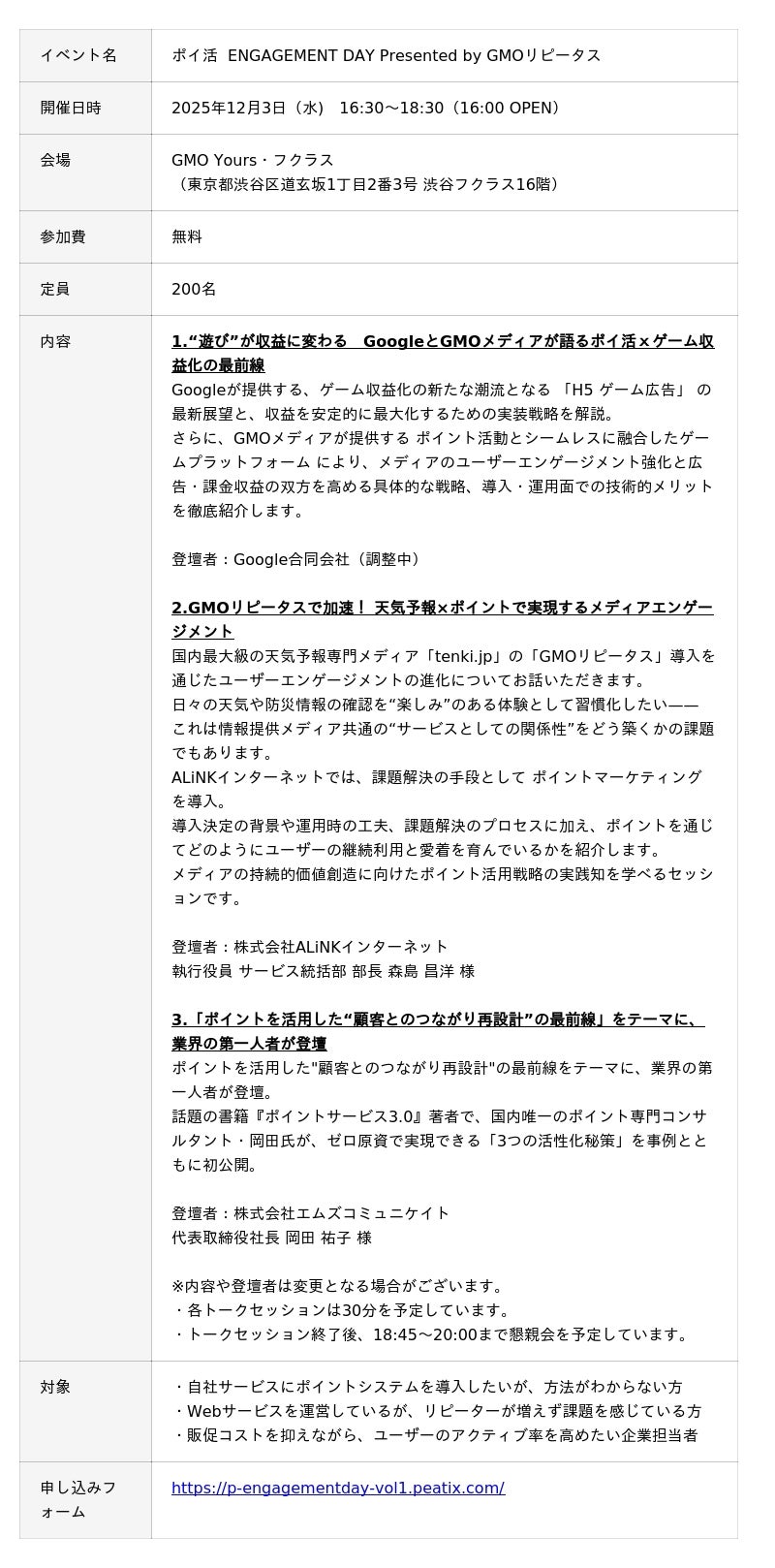 GMOインターネットグループのGMOメディア株式会社(代表取締役社長:森 輝幸 以下、GMOメディア)が運営するポイントCRM(※)「GMOリピータス」は、2025年12月3日(水)に、初のオフラインイベント『ポイ活 ENGAGEMENT DAY Presented by GMOリピータス』をGMO Yours・フクラス(東京都渋谷区)にて開催します。