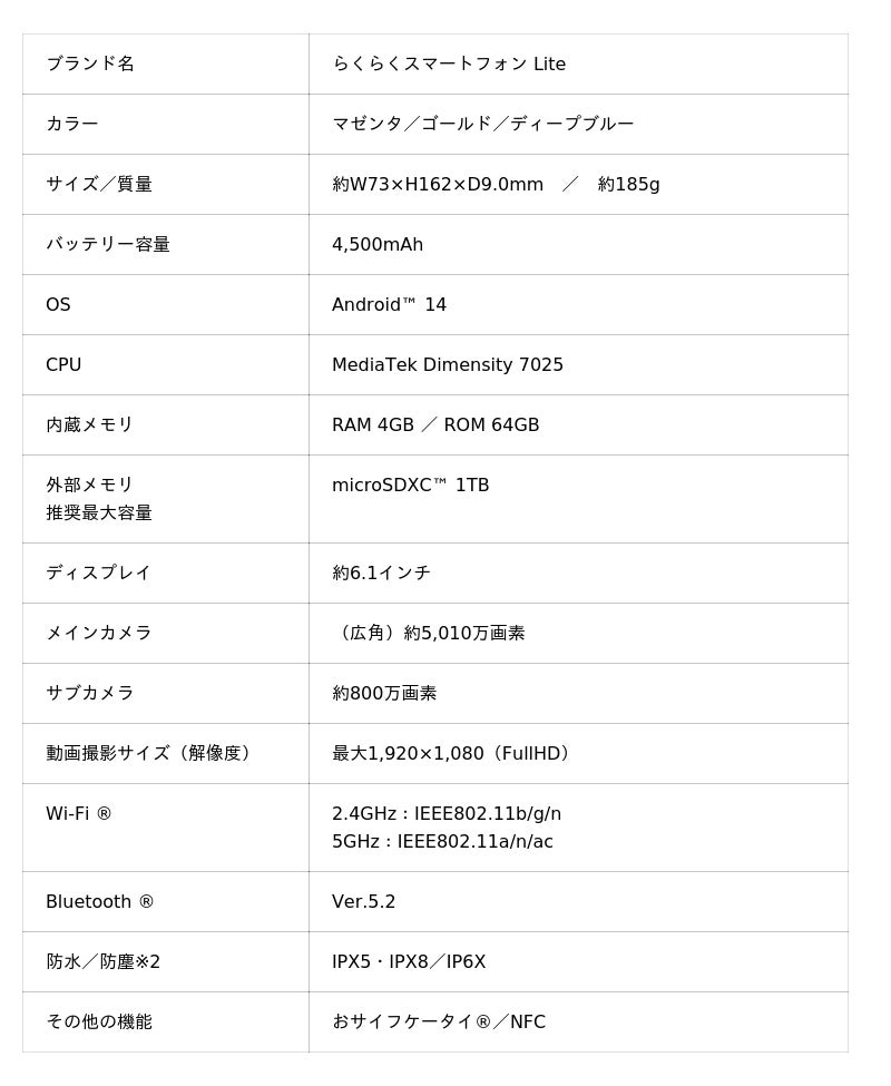 【らくらくスマートフォン Liteの特長】