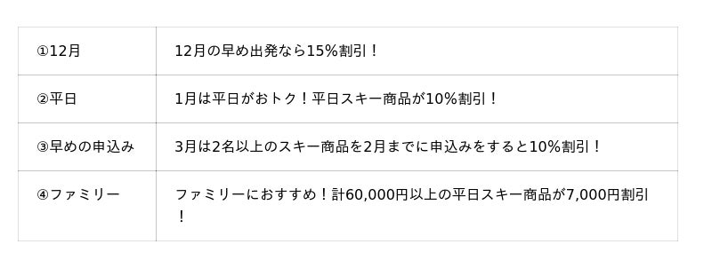 ⑵ 「JR SKISKI」割引クーポンの配布~今年のオススメは、1.12月、2.平日、3.早めの申込み、4.家族で!!~