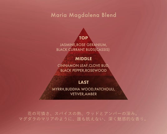 マグダラのマリアの名を冠した香り『MMブレンド』は、香油文化が持つ精神性を、現代に共鳴させるよう再構築した香りです。