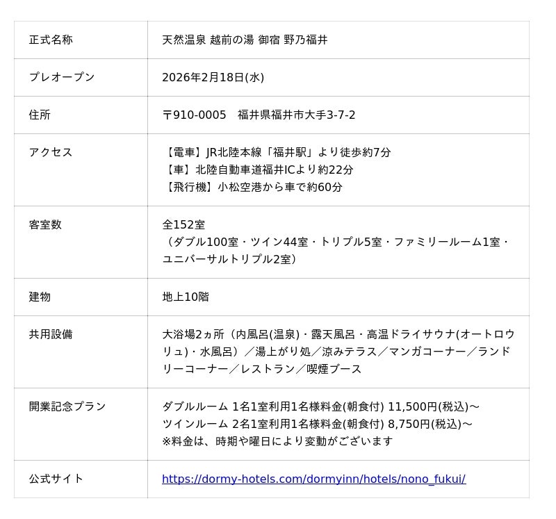 全国にビジネスホテル 「ドーミーイン」やリゾートホテル「共立リゾート」を運営する株式会社共立メンテナンス(以下、共立メンテナンス/代表取締役社長:中村 幸治/本社:東京都千代田区)は、2026年2月18日(水)のプレオープンに先がけて、2025年11月28日(金)より『天然温泉 越前の湯 御宿 野乃福井』の公式サイトにて先行予約受付を開始いたしました。
