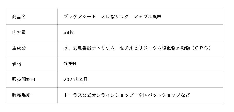 トーラス株式会社(本社:神奈川県綾瀬市、代表取締役:赤津徳彦)は、犬猫用デンタルケア製品「プラケアシート3D指サック」シリーズより、新たに**《アップル風味》**を発売いたします。