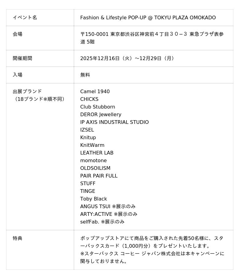 ファッションとライフスタイルのデザインを横断する18ブランドが集まる期間限定イベント 『Fashion & Lifestyle POP-UP @ TOKYU PLAZA OMOKADO』 を、2025年12月16日(火)~29日(月)、東急プラザ表参道5階にて開催いたします。本イベントでは、ジュエリー、バッグ、アパレル、ホームプロダクトなど、デザイナーの世界観を感じられる、ホリデーギフトにもぴったりの限定商品がラインナップします。クリスマス直前の時期に合わせ、冬の装いを豊かにするデザインや“自分へのご褒美ギフト”にもふさわしいブランドを揃え、表参道のホリデーシーズンに新たな買い物体験を提供します。