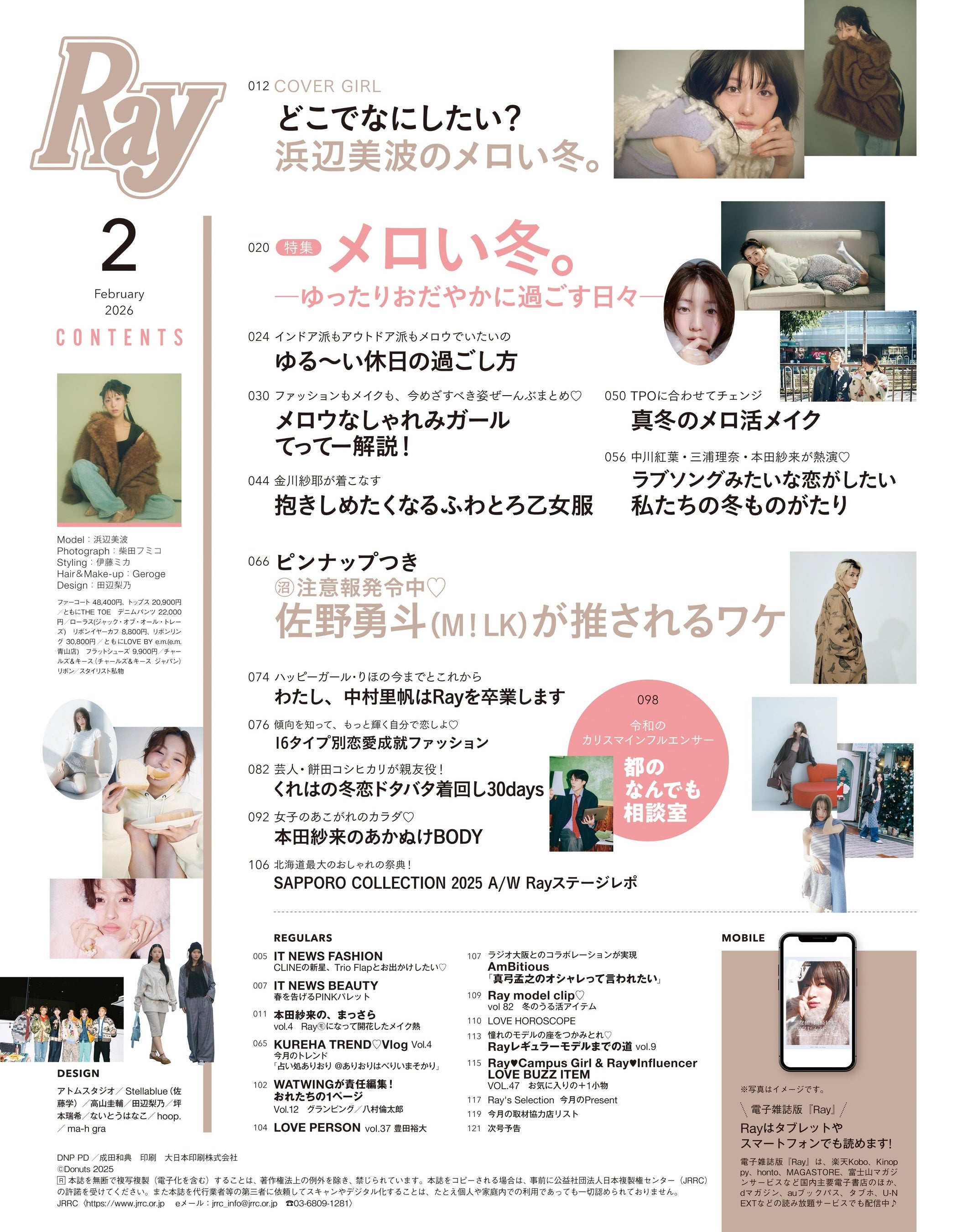 2025年12月23日(火)に発売する『Ray』2026年2月号の通常版表紙は浜辺美波さん、特別版表紙は佐野勇斗さん(M!LK)がそれぞれ務めます。今号の大特集テーマは「メロい冬。」。がんばりすぎないメロウな冬の過ごし方を、ファッションやメイク、おでかけスポット情報を交えながらたっぷりとお届けします。【商品情報】