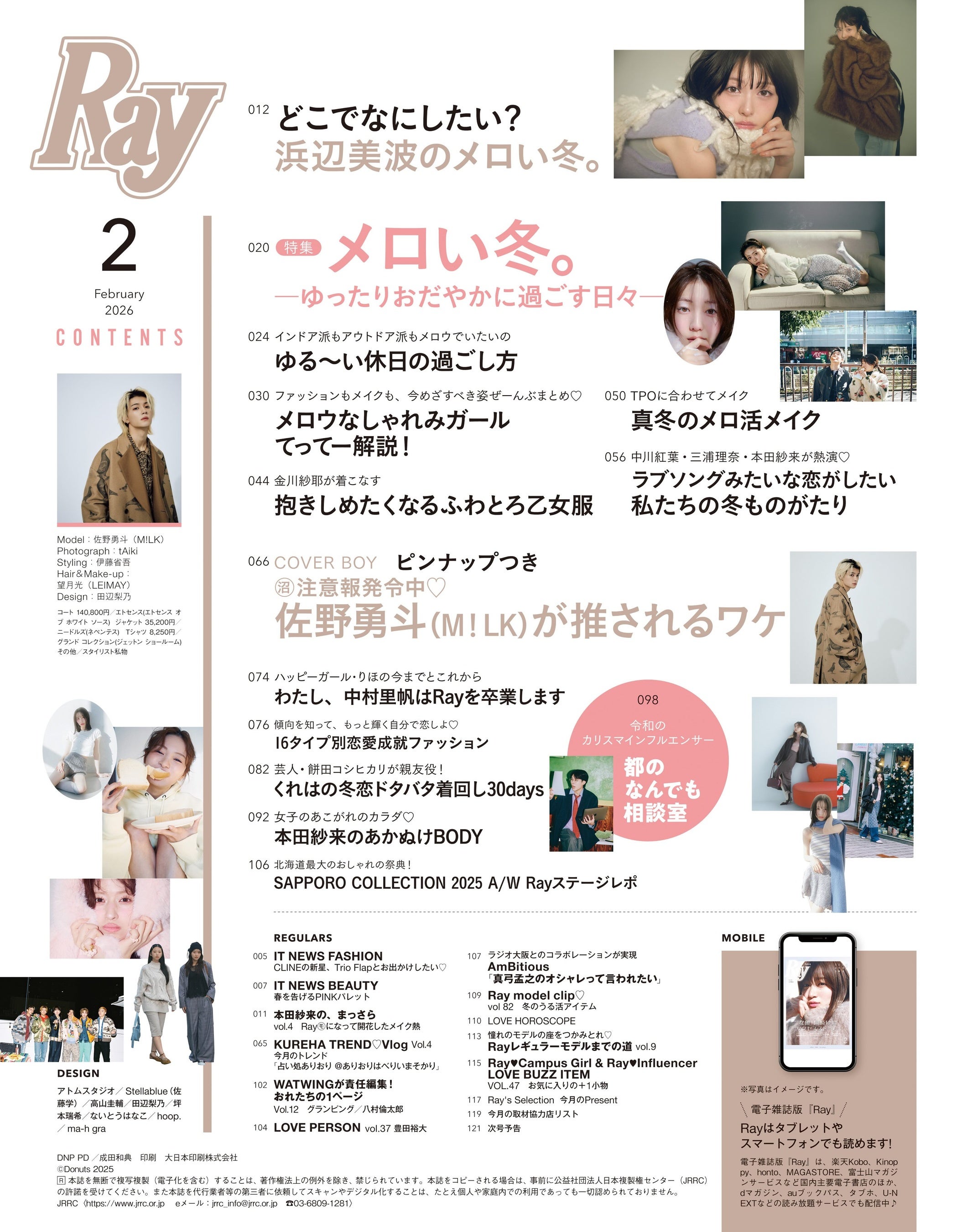 特別版表紙は、佐野勇斗さん(M!LK)がついに『Ray』に初登場!個性的なジャケットにヒョウ柄シャツを合わせたスタイリングをクールな表情でサラッと着こなしている佐野さんの表紙カットに誰もが目を奪われること間違いなし!首元にチラッと見えるゴールドアクセが色気を増幅させる一枚です。カバーボーイ企画では、「佐野勇斗(M!LK)が推されるワケ」と題して、ビジュアルなど外見に関する質問から、周囲とのコミュニケーションの取り方など内面に関することまで、パーフェクト男子を代表する佐野さんが老若男女問わず推されるモテ事情について自己分析してもらいました。色気をまとう表情やメガネ姿、ふと見せるギャップにメロ落ち確定です。お仕事に関するインタビューでは、2025年11月に11周年を迎えたグループ活動についても「僕の根底には、M!LKとして高みを目指したいという目標があるのでがんばれています。」という熱い想いを語ってくれました。また、2026年1月8日(木)からスタートするドラマ『おコメの女-国税局資料調査課・雑国室-』(テレビ朝日系列)での気になる役どころについても教えてくれました。
