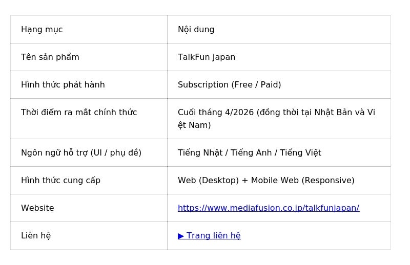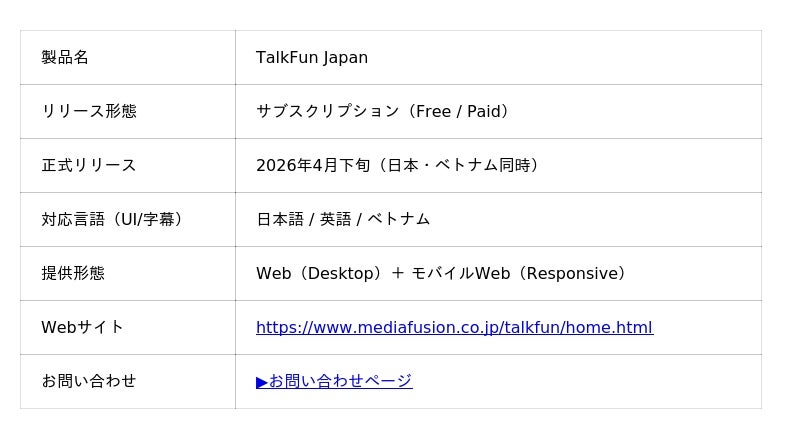 Công ty Media Fusion Co., Ltd. (trụ sở chinh tại Osaka) sẽ chinh thức phat hanh bản β của nền tảng học tập “TalkFun” vao cuối thang 4 năm 2026. Nền tảng nay được phat triển nhằm nang cao khả năng sử dụng tiếng Nhật thực tiễn, gắn trực tiếp với giao tiếp trong đời sống thực tế.