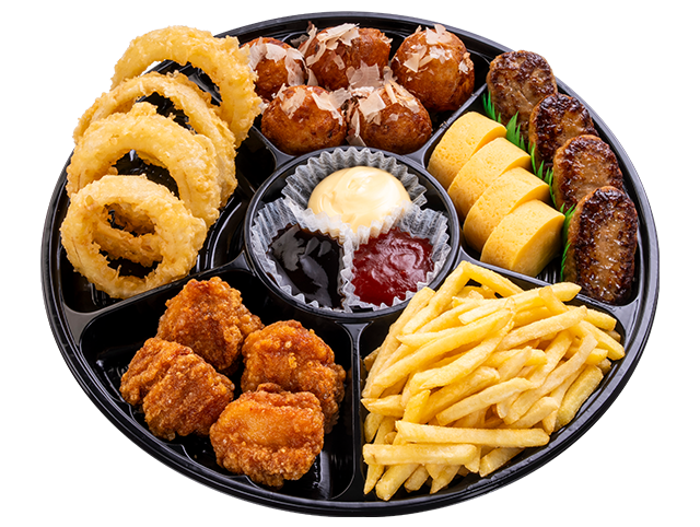ご家族やご友人が集まる食卓をぐっと華やかにする、満足感たっぷりの『華やかごちそうオードブル』。大玉揚げたこ焼きや、食べ応えあるハンバーグや、特盛のフライドポテトなど、人気メニューをぎゅっと詰め込みました。おこさまから大人まで楽しめる味わいで、ホームパーティーや週末のごちそうにぴったりです。