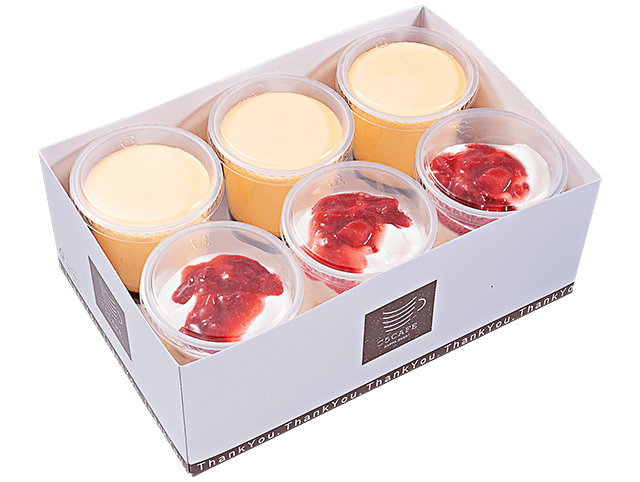 人気の「プレミアムプリン」と「いちご練乳の杏仁豆腐」をセットにした満足BOX。手土産や家族団らんにぴったりで、単品で購入するより100円(税込)お得な商品です。ちょっとした集まりにも嬉しい逸品です。