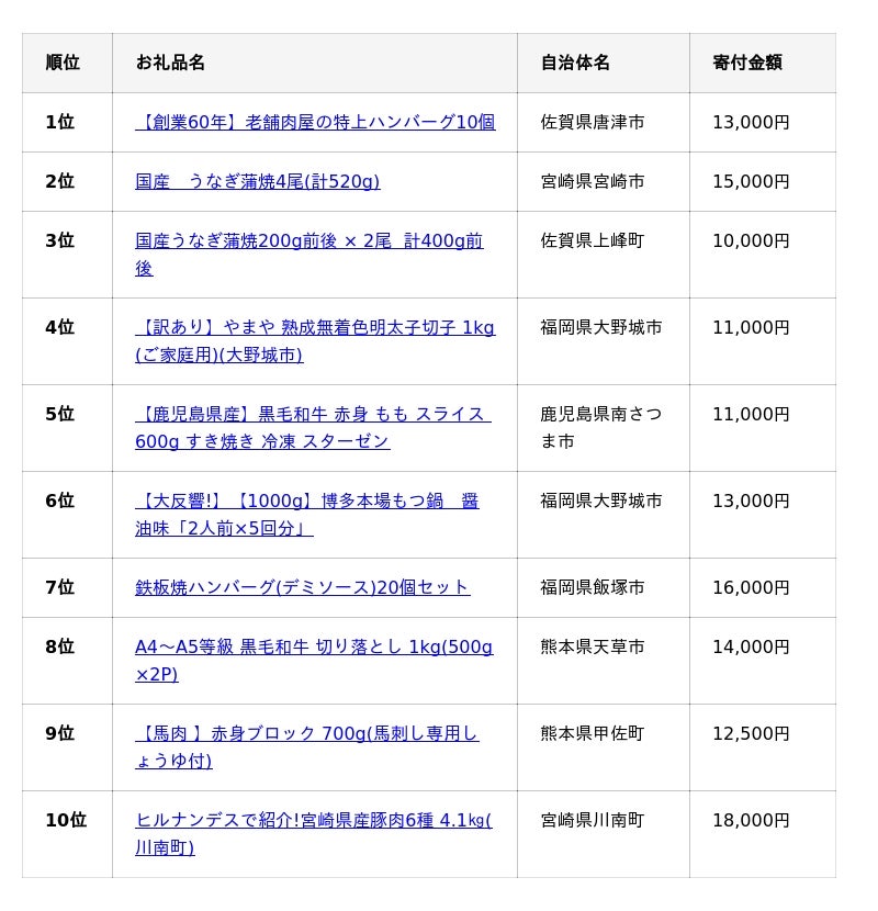 「肉」カテゴリのお礼品7件がTOP10入り。九州産の人気が際立つ ~“実用性重視”の「訳あり」や「大容量」と、“ご褒美グルメ”の「うなぎ」が並ぶ~