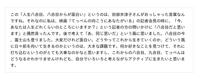 2.『家庭画報』のインタビューの中で「今は人生八合目」とお話されておりますが、「八合目」というのは、お仕事、人生すべて含めて、吉永さんにとってこれから八合目、九合目に向かうという感じでしょうか。