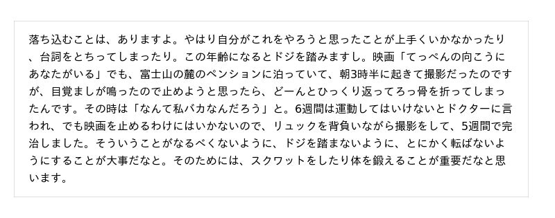 3.私は“反省はしても後悔はしない”という小百合さんのお言葉にとても共感しています。とはいえ、時には落ち込むこともあります。小百合さんご自身が落ち込むことはありますか?もしある場合、どのように乗り越えてこられたのか教えていただけますか。(イベント参加者より質問)