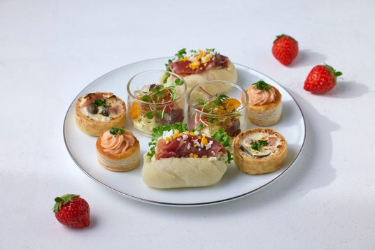 セイボリーは、新春の彩りを感じさせるメニューを揃えました。ミモザのように華やかな「ポテトサラダと生ハムのドックサンド」や、バジルの香りが広がる「モッツアレラ トマト オリーブのバジルトマトジュレ」、軽やかなパイ生地で仕上げた「サーモンムースのボローバン」など、甘いスイーツの合間にリフレッシュできる味わいです。