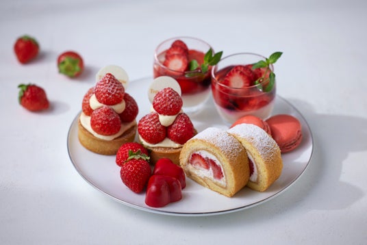 「苺のタルト」や「苺ロール」、「苺とアプリコットのスコーン」など、独創的な苺スイーツを約20種類のドリンクとともに