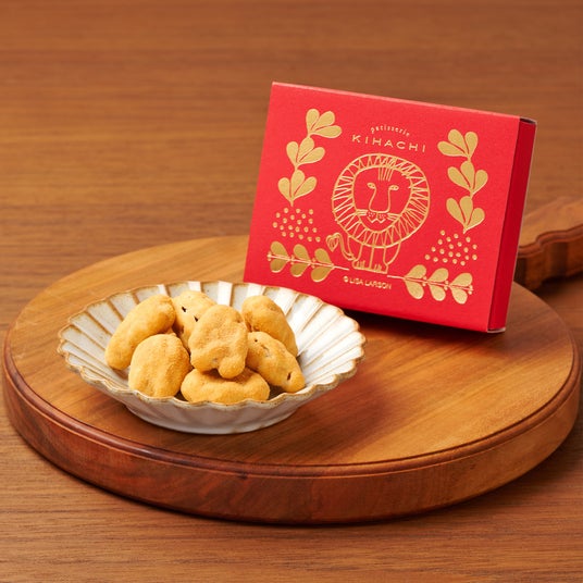きらりと光るライオンの金箔パッケージの〈ペカンナッツショコラ キャラメル〉と、〈ライオン・ミディアム〉。ナッツの香ばしさとキャラメルの風味を楽しめるキハチ×リサ・ラーソンでは初登場の商品です。
