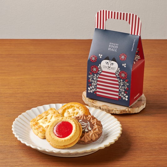しましま模様の〈ミンミ〉が主役のパッケージなので、ミンミ尽くしの楽しいセットを作りました。4つの味が楽しめる、〈トゥワイス ベイクド クッキー〉はしっとりほろっと食感の人気商品です。