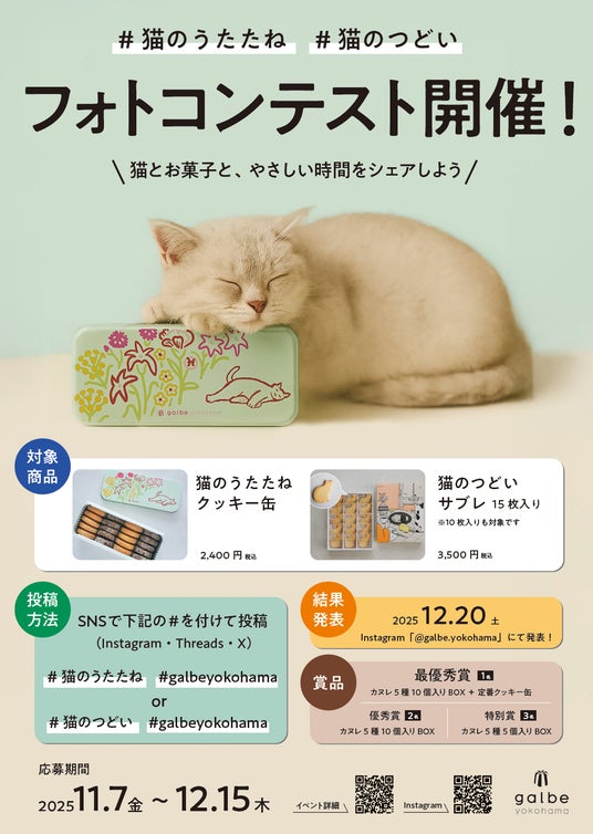 なお、galbe yokohamaでは11月7日よりInstagramフォトコンテスト 「#猫のうたたね」 を開催いたします。対象商品を購入後、ハッシュタグを付けて公開投稿いただいた作品からスタッフが選出し、受賞作は公式SNS等でご紹介・galbeの焼き菓子を進呈します(詳細は公式SNSをご確認ください)。