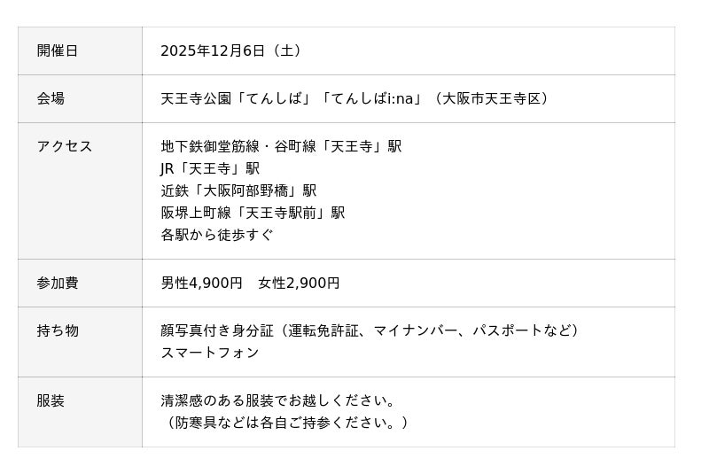 国内最多*¹の成婚数を誇る株式会社IBJ(代表取締役社長:石坂茂/本社:東京都新宿区/東証プライム:6071、以下「IBJ」)が運営する婚活パーティーサービス「IBJ Matching」は、2025年12月6日(土)、大阪市天王寺公園で開かれる人気イベント「クリスマスマーケット in 大阪 てんしば 2025」とコラボレーションし、特別企画の婚活パーティーを開催いたします。イルミネーションが輝くロマンチックな空間で、クリスマス本番を前に“心あたたまる出会い”を提供します。