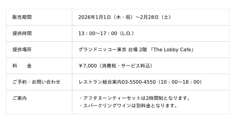 「東京を楽しむ 東京をくつろぐ」ひとときをお届けするグランドニッコー東京 台場(住所:東京都港区 総支配人:塚田 忠保)は、吹き抜けのロビーフロアに心地よい光が降り注ぐ「The Lobby Cafe」にて、甘くみずみずしい“あまおう”を存分に味わえる『あまおうアフタヌーンティーセット ~赤い宝石~』を2026年1月1日(木・祝)~2月28日(土)の期間限定で提供いたします。