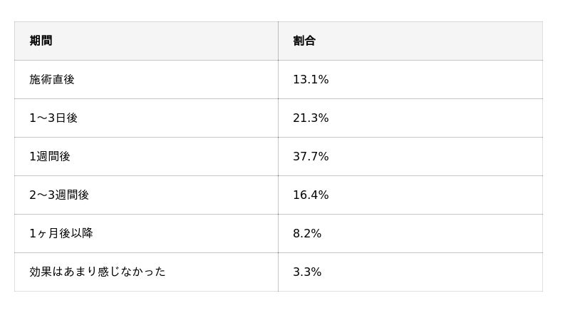- 効果を感じた時期は1週間後が最多で、直後~数週間以内に実感したという回答が多い