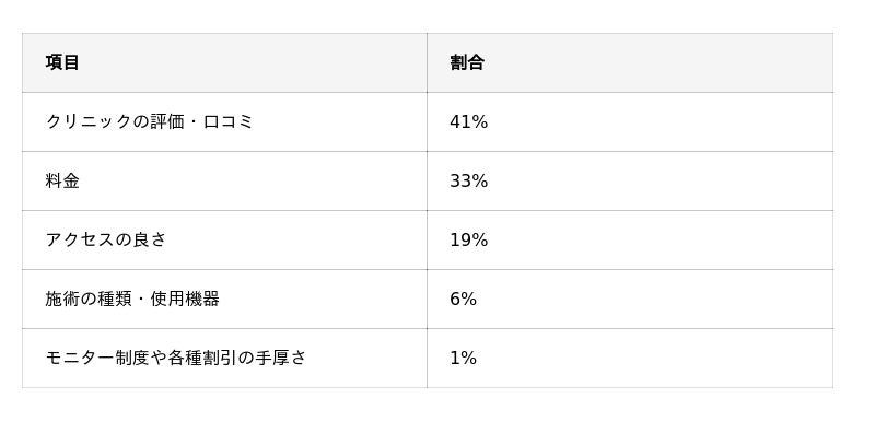 - クリニックを選んだ決め手について40%の人が「クリニックの評価・口コミ」と回答