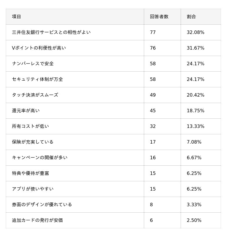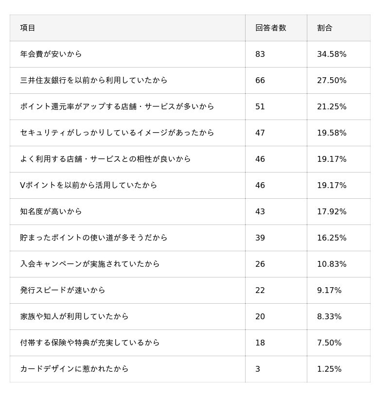 - 三井住友カードを選んだ理由TOP3は「年会費が安いから」「三井住友銀行を以前から利用していたから」「ポイント還元率がアップする店舗・サービスが多いから」。