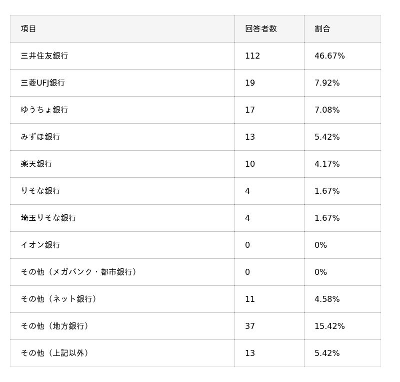 - 三井住友カードの引き落とし口座は「三井住友銀行」が最も多く、全体の約47%を占める。次いで「その他(地方銀行)」が約15%、「三菱UFJ銀行」が約8%と続く。