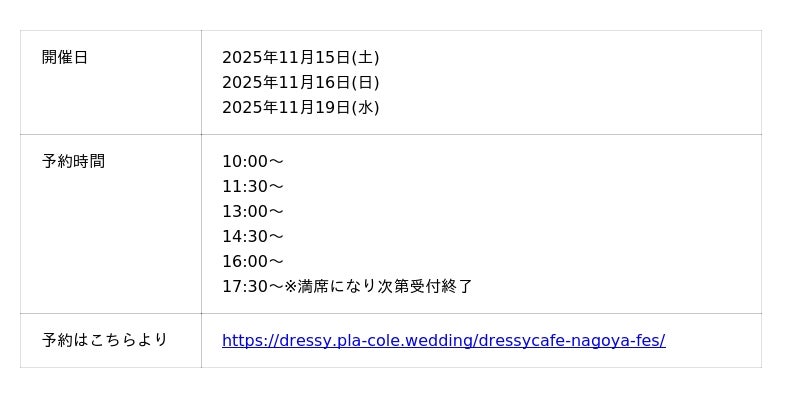 「PLACOLE & DRESSY」ブランドを展開する、冒険社プラコレ(本社:神奈川県鎌倉市、代表取締役CEO:武藤功樹)は、名古屋駅直結商業施設KITTE名古屋3F、ウェディングのテーマパークカフェ"DRESSY CAFE"にて、11/15(土)16(日)19(水)の3日間限定で、これから結婚式をお考えのカップル様に向けた、個室相談やウェディングドレス試着ができる豪華特典付きのウェディング初体験フェスを開催いたします。(40組様限定、無料開催)