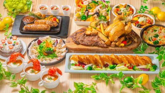 ゴールデンウィーク限定の特別メニューが勢ぞろいする本フェアでは、シェフが目の前で焼き上げる国産牛ステーキやローストチキン、濃厚ビスクスープ、パスタなど、世代を問わずお楽しみいただけるお料理を取り揃えました。前菜からデザートまで、ランチは約60種類、ディナーは70種類以上のメニューが並びます。