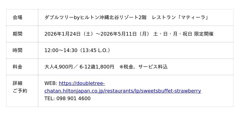 【2025年12月10日】ダブルツリーbyヒルトン沖縄北谷リゾート(北谷町(ちゃたんちょう)美浜(みはま) 統括総支配人 宍倉裕(ししくらゆたか))は、2026年1月24日(土)から2026年5月11日(月)まで、2階レストラン「マティーラ」にてランチ&スイーツビュッフェ『ストロベリービュッフェ~永遠の春が訪れるプリンセスガーデン~』を開催いたします。