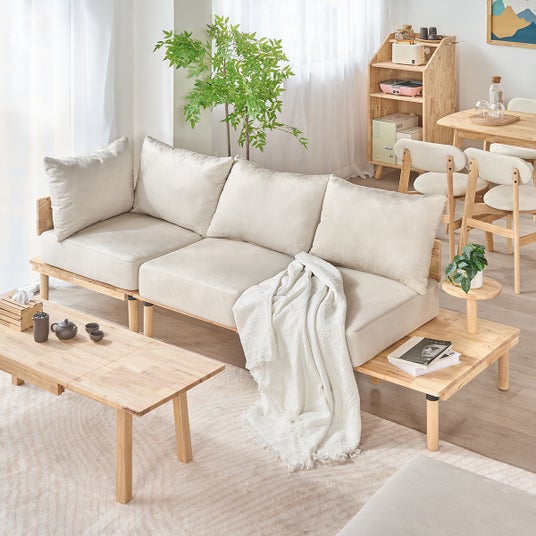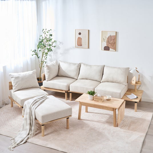 今回、リビングの主役となるソファがシリーズに加わりました。シリーズの特徴である天然木の美しさや温もりはそのままに、2人掛け・1人掛け・コーナー・オットマンを組み合わせることで、お部屋のスペースやご家族の人数に合わせてお使いいただくことができます。