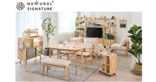 『NATURAL SIGNATURE(R)』は、空間に溶け込むシンプルなデザイン、環境への影響が少ないサステナブル素材ラバーウッド、ひとつひとつ異なる節や木目、時間とともに変化する天然木の美しい色合いなど、長く使うほどに愛着が増していくそんな家具に囲まれる心地良い暮らしを提案します。