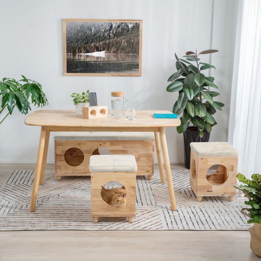 ペットと一緒に過ごせるスツールも新たに発売します。リビングでのご使用だけではなく、ダイニングのチェアやベンチの代わりに使えば、もっとペットを身近に感じるダイニングの空間になります。