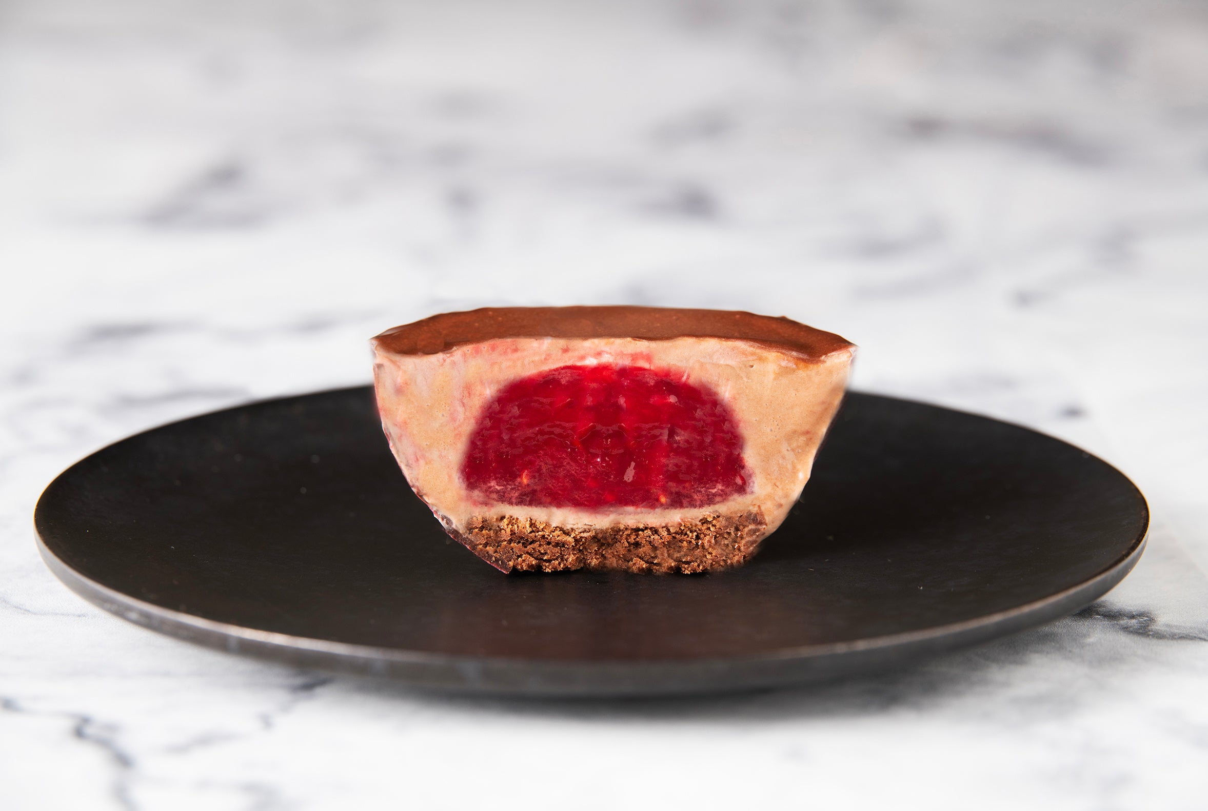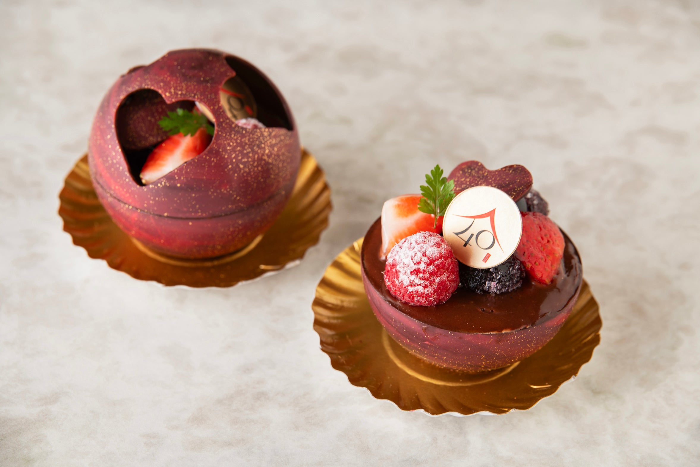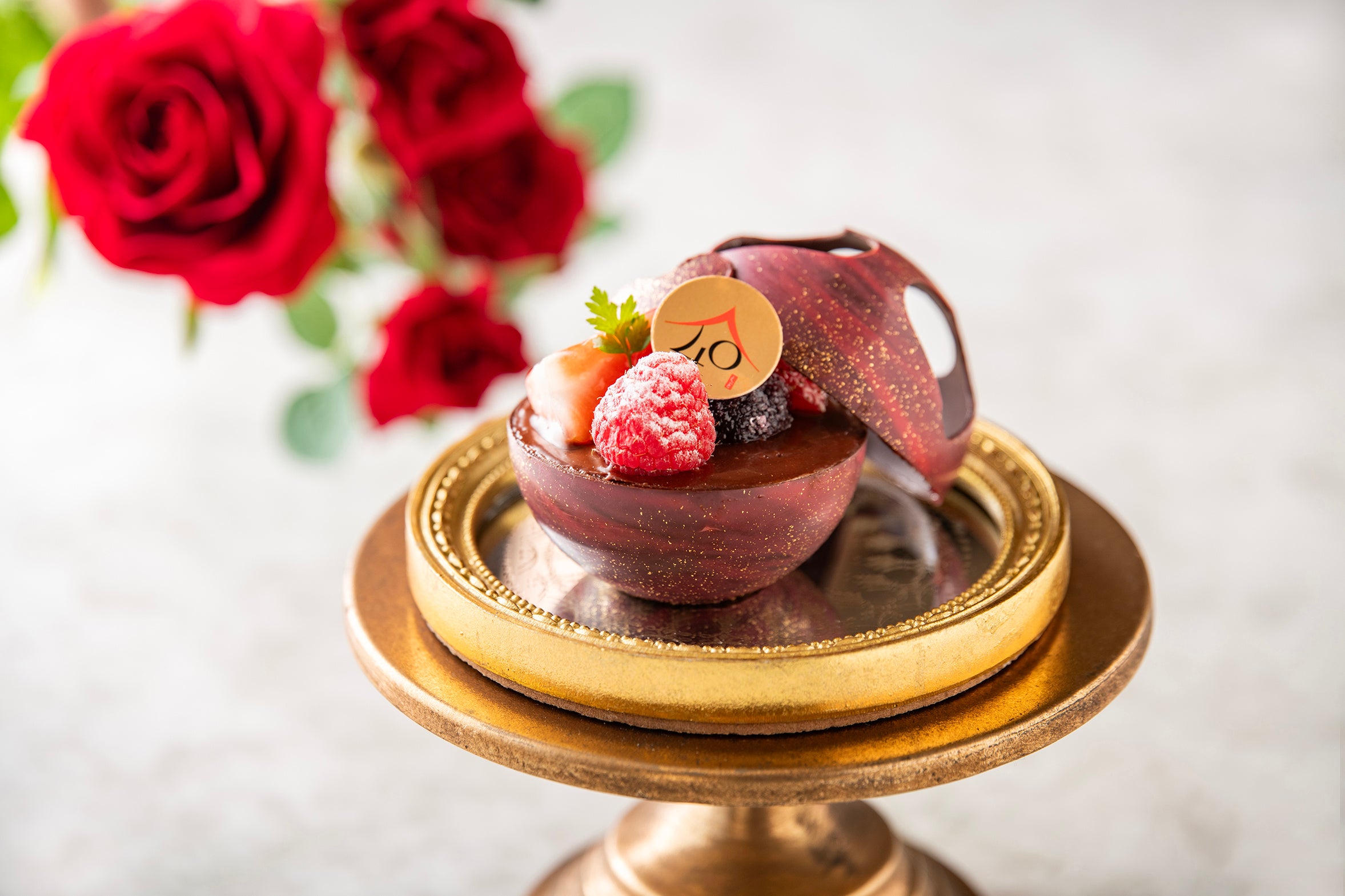 ハート型で抜いた球体のチョコレートの器に、口当たりの軽いチョコレートの生地と滑らかなチョコレートクリームをあわせたガトー。味のアクセントには爽やかな酸味のフリュイルージュのクーリーを合わせた一品で、贈り物やご自身へのご褒美にぴったりです。