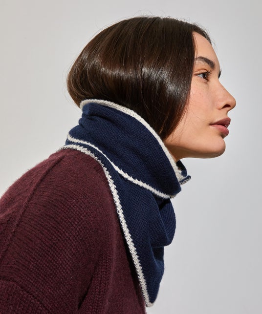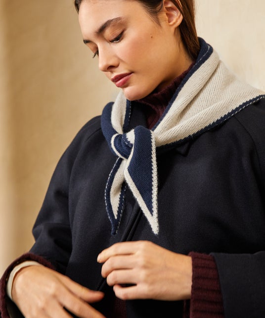 パリでも日本でもトレンドの、三角シェイプのニットスカーフ。リバーシブル仕様で、巻き方次第で首元を温めるだけでなく、頭に巻いてパリジェンヌ風のスタイリングも楽しめます。