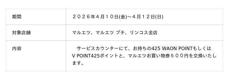 株式会社マルエツ(本社:東京都豊島区、代表取締役社長:本間 正治)は、4月10日(金)から4月12日(日)まで、お持ちのWAON POINTまたはV POINTがおトクにお買物券に交換できる企画を実施いたします。本企画では、マルエツ全店舗(魚悦糀谷店を除く)のサービスカウンターにて、お持ちの425WAON POINTもしくはV POINT425ポイントと、マルエツお買物券500円を交換いたします。毎月第2週に実施している交換条件(475ポイントで500円分)よりも、さらにおトクにご利用いただける企画です。この機会にWAON POINTとVPOINTをマルエツでご利用ください。