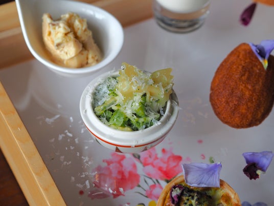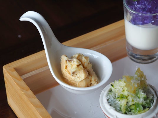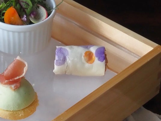 「枝豆のムースとチーズサブレ 生ハム乗せ」は、枝豆のほのかな甘みとうま味に、チーズのコクと塩味が重なり合う、奥行きのある味わいに仕上げました。