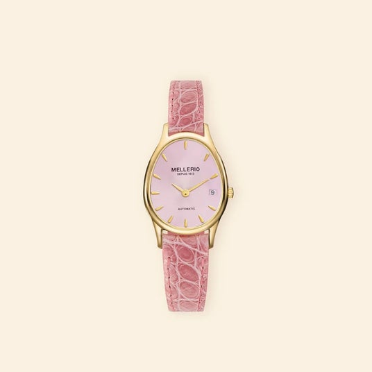 Mini M cut Automatic Watch ピンクピンクダイヤルを備えた Mini M Cut Automatic Watch。
