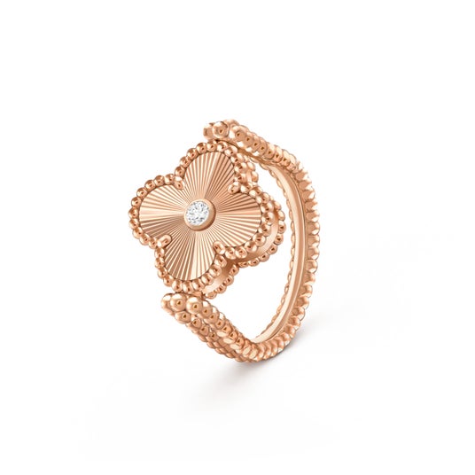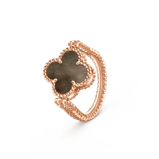 アルハンブラ コレクションはその誕生以来、あらゆるシーンやスタイルに寄り添う作品を通して、日常におけるジュエリーの新たな楽しみ方を切り拓いてきました。この精神のもと、2連のゴールドビーズで縁取られたヴィンテージ アルハンブラ リバーシブル リングが、2タイプの新たな素材とカラーで登場します。一方の作品は、光沢の美しさとシルバーグレーの深い色調が目を引くグレー マザーオブパールがあしらわれています。モチーフを回転すると中央にダイヤモンドが1石セットされ、ギヨシェ彫りを施したローズゴールドと輝きのハーモニーを奏でます。もう一方の作品は、ホワイトゴールドがカルセドニーの波打つように変化する色調と美しく融合しています。裏面には同じく1石のダイヤモンドがセットされ、光を受けて煌めきます。ギヨシェ彫りによりホワイトゴールドに刻まれた繊細なラインが、その輝きを一層引き立てます。