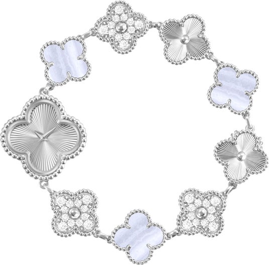 カルセドニーは、微細な石英の結晶が凝縮してできた鉱物の仲間です。半透明の質感とまろやかなニュアンスを特徴とし、ホワイトが入り混じっている場合もあります。ヴァン クリーフ&アーペルでは、グレーから鮮やかなブルーやラベンダーまでの色調のものを選んでいます。光沢のある表面と調和の取れた縞模様により、アルハンブラ コレクションの象徴的なモチーフを飾る宝石として採用されています。