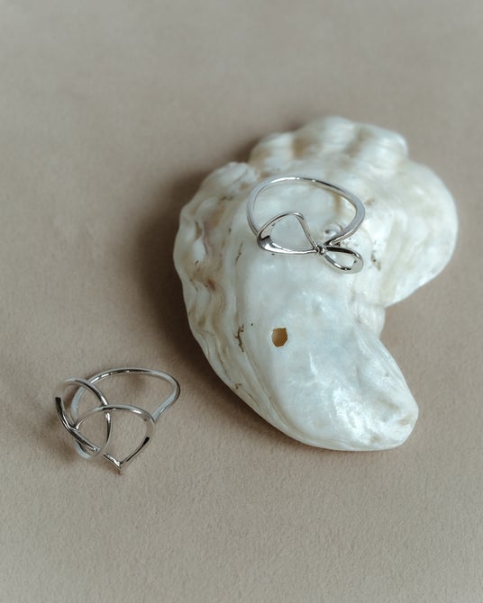 一筆書きで描いたハートとリボンのモチーフが指先に大人可愛い印象を与えるリングは、丁寧に磨かれたシルバーの艶が上品に輝き、洗練されたムードを演出。甘すぎず抜け感のあるデザインは、大人の女性にふさわしい華やかさを添えます。