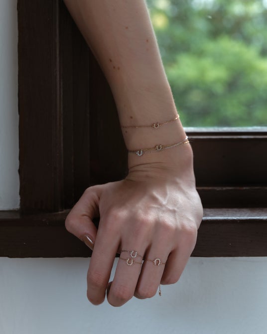 幸運を呼び込む馬蹄モチーフのチェーンリング。9石のダイヤモンドが指先に上品な輝きを添えます。馬蹄は「幸運を呼び、厄を払う」とされるお守りモチーフ。新年の装いにはもちろん、大切な人へのギフトにもおすすめです。