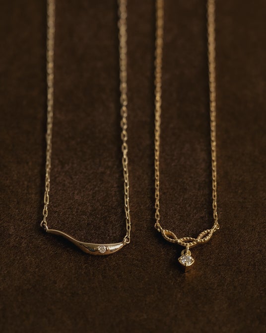 ひねりを加えた流線ラインが美しいネックレスが登場。トップには1粒のダイヤモンドを沿わせ、肌の上で繊細にきらめきます。手持ちのネックレスとのレイヤードも楽しめ、デコルテに馴染む上品なデザインです。