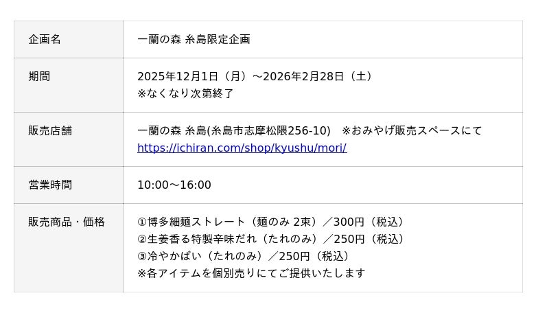 株式会社一蘭では、2025年12月1日(月)~2026年2月28日(土)の期間、好評につき完売した人気商品を「一蘭の森 糸島」限定で復刻販売いたします。