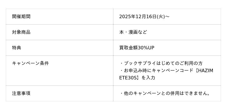 こうした背景を踏まえ、ブックサプライでは、はじめての方にも安心してサービスを体験していただける機会として、今だけ買取金額が30%アップするキャンペーンを実施いたします。