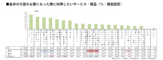 - 介護の際に利用したいサービス・商品は、「デイサービス・デイケア」を筆頭に代行業系など生活基盤を支えるもの。最新技術を活用したサービスへの支持はまだ低い。